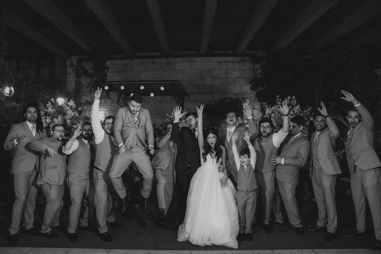 “Começamos nossas fotos formais de família um pouco antes da chegada dos convidados e optamos por fotografá-las contra uma das paredes bonitas dentro de nossa área de coquetel. Isso significava que ninguém ia longe quando precisávamos deles para várias configurações, e eu podia ver e passar mais tempo com nossos convidados enquanto eles chegavam, em vez de estar em algum lugar tirando fotos. Terminamos com tempo de sobra para aproveitar a hora do coquetel e fizemos a transição para fotos divertidas com nossos convidados!” - Kate W., Nova York, NY